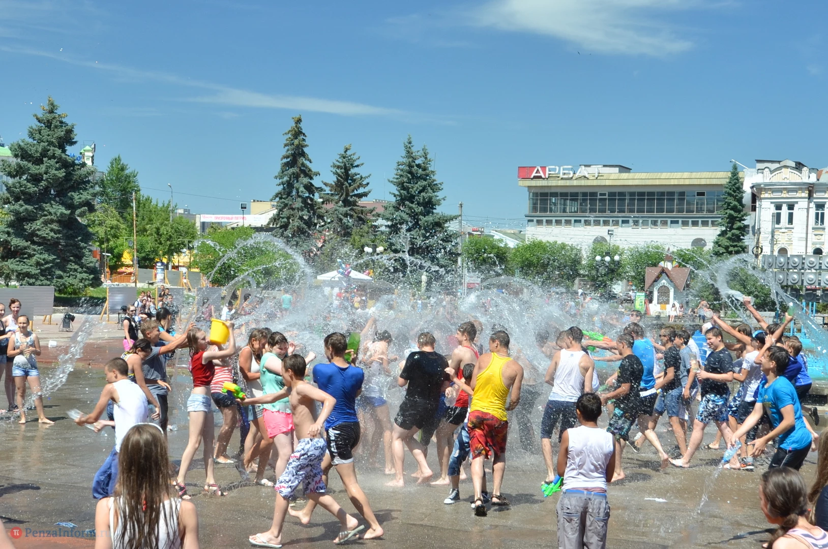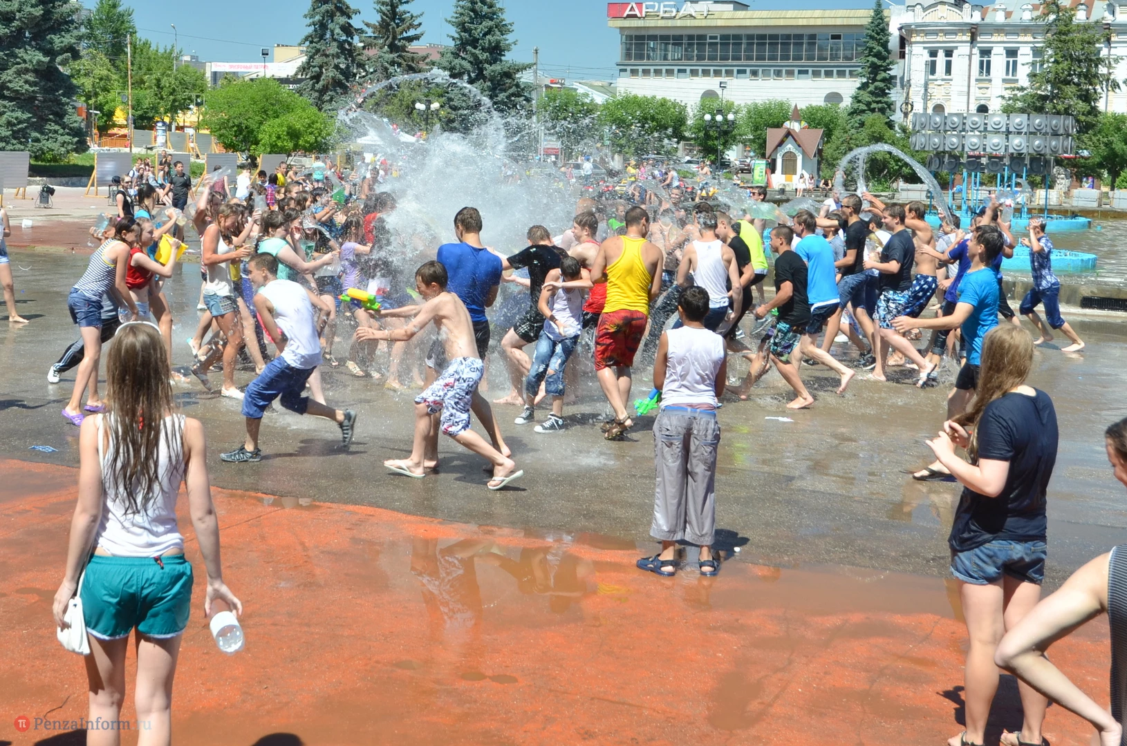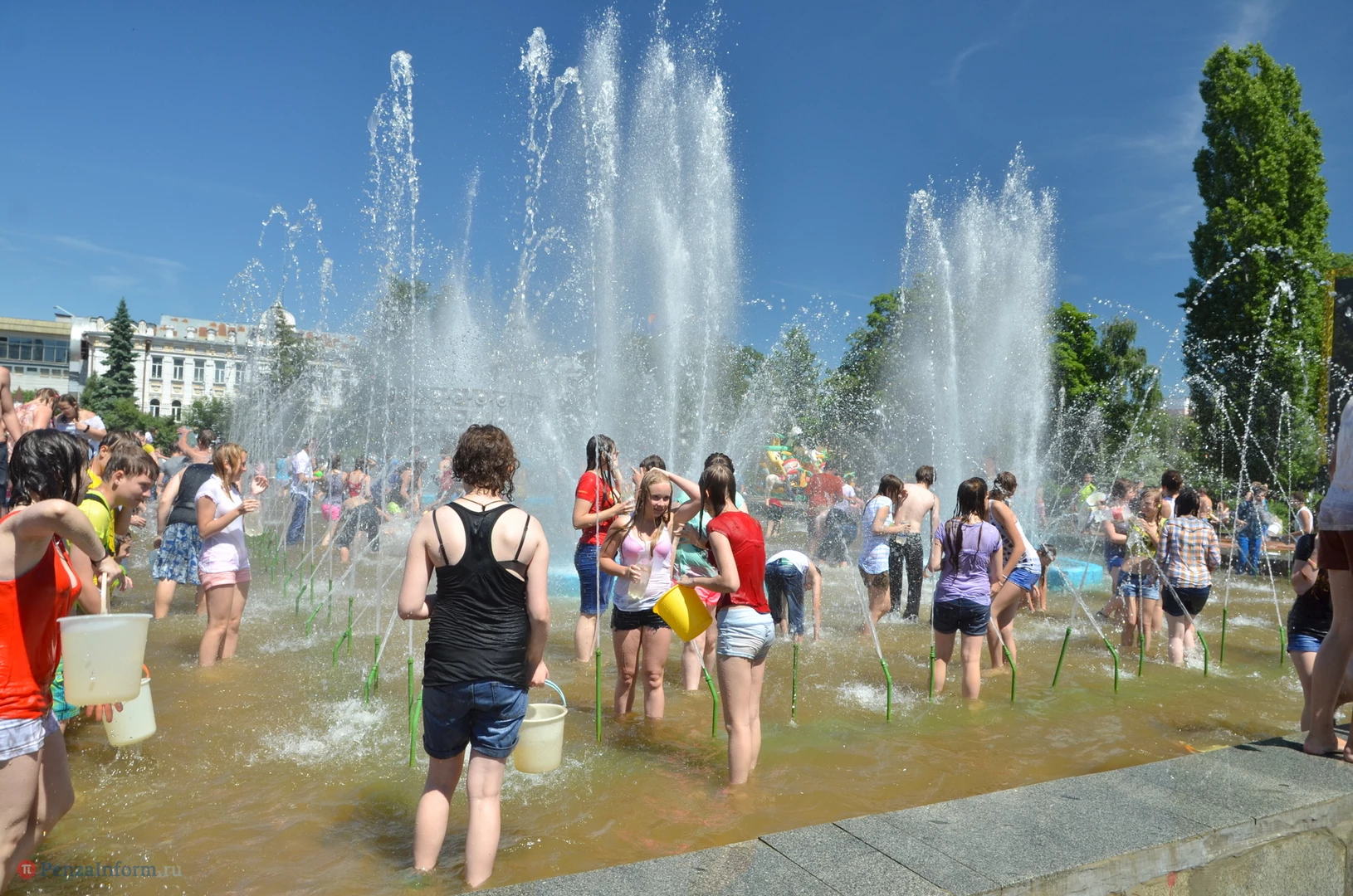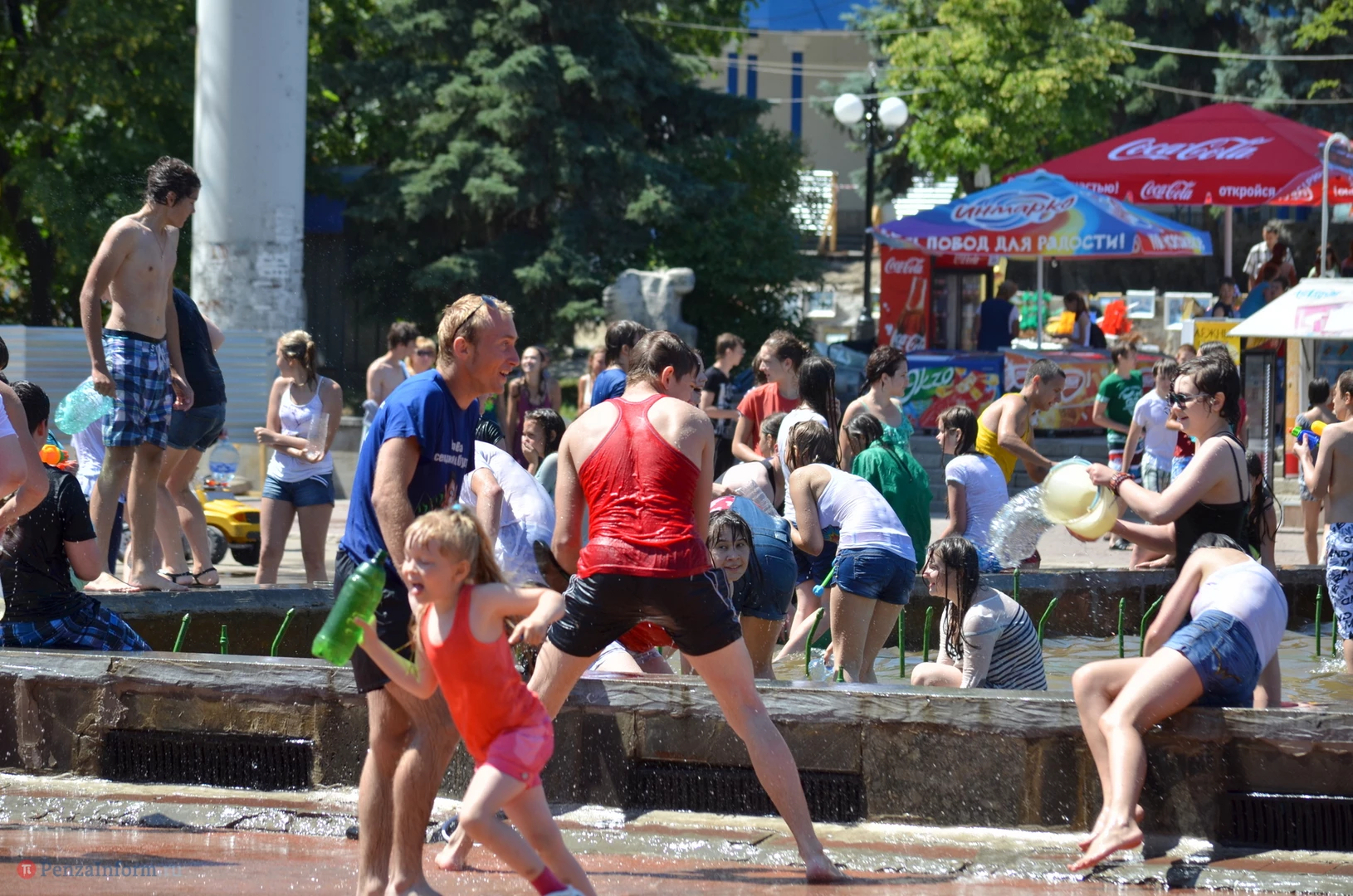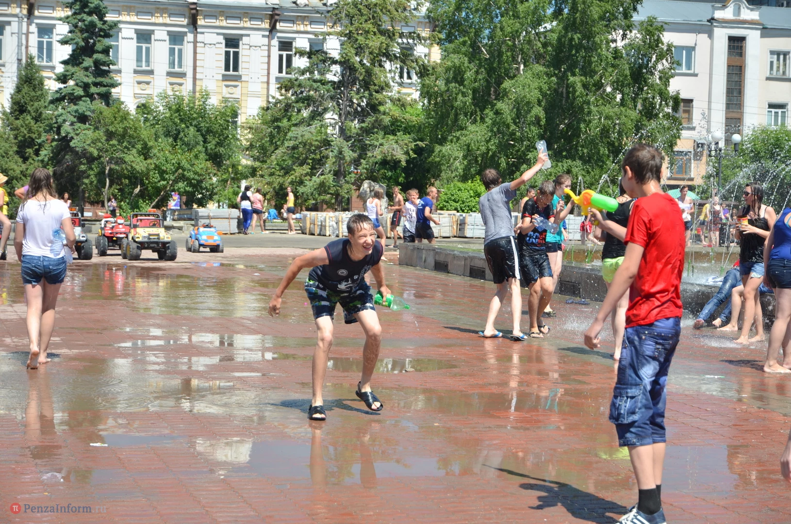 На Фонтанной площади произошло настоящее побоище. В ход шли пистолеты, бутылки, банки и тяжелая артиллерия - ведра. Вся площадь была залита водой. В раскаленном городе дети получили возможность вдоволь понарушать - побегать по фонтану, облить водой всех и вся. Самое веселье началось в час дня, когда начали иссякать боеприпасы - был включен фонтан.