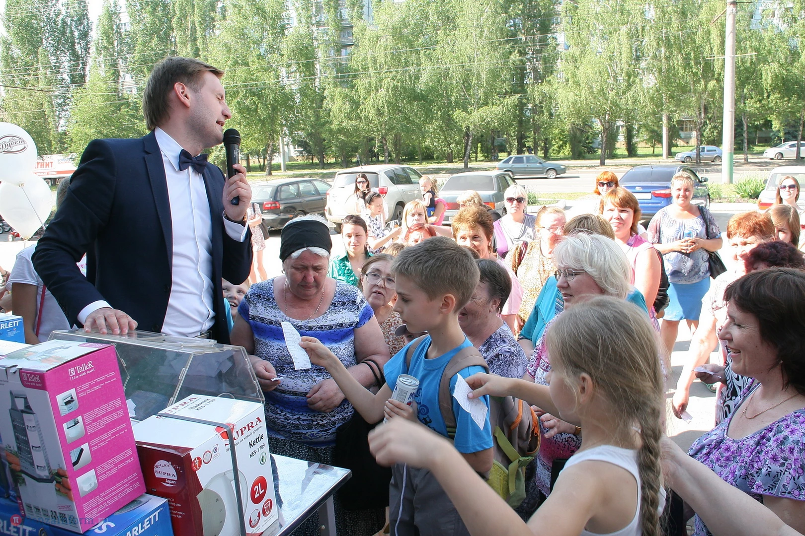 Каждого, кто приобрел товар на сумму свыше 500 рублей, ждал билет беспроигрышной лотереи. Призы: продовольственные наборы, вентиляторы, кофемолки, чайники, мобильные телефоны, фены, утюг, чайник-фильтр для воды, мультиварка и телевизор. С праздника без подарка от «Каравана» не ушел никто.