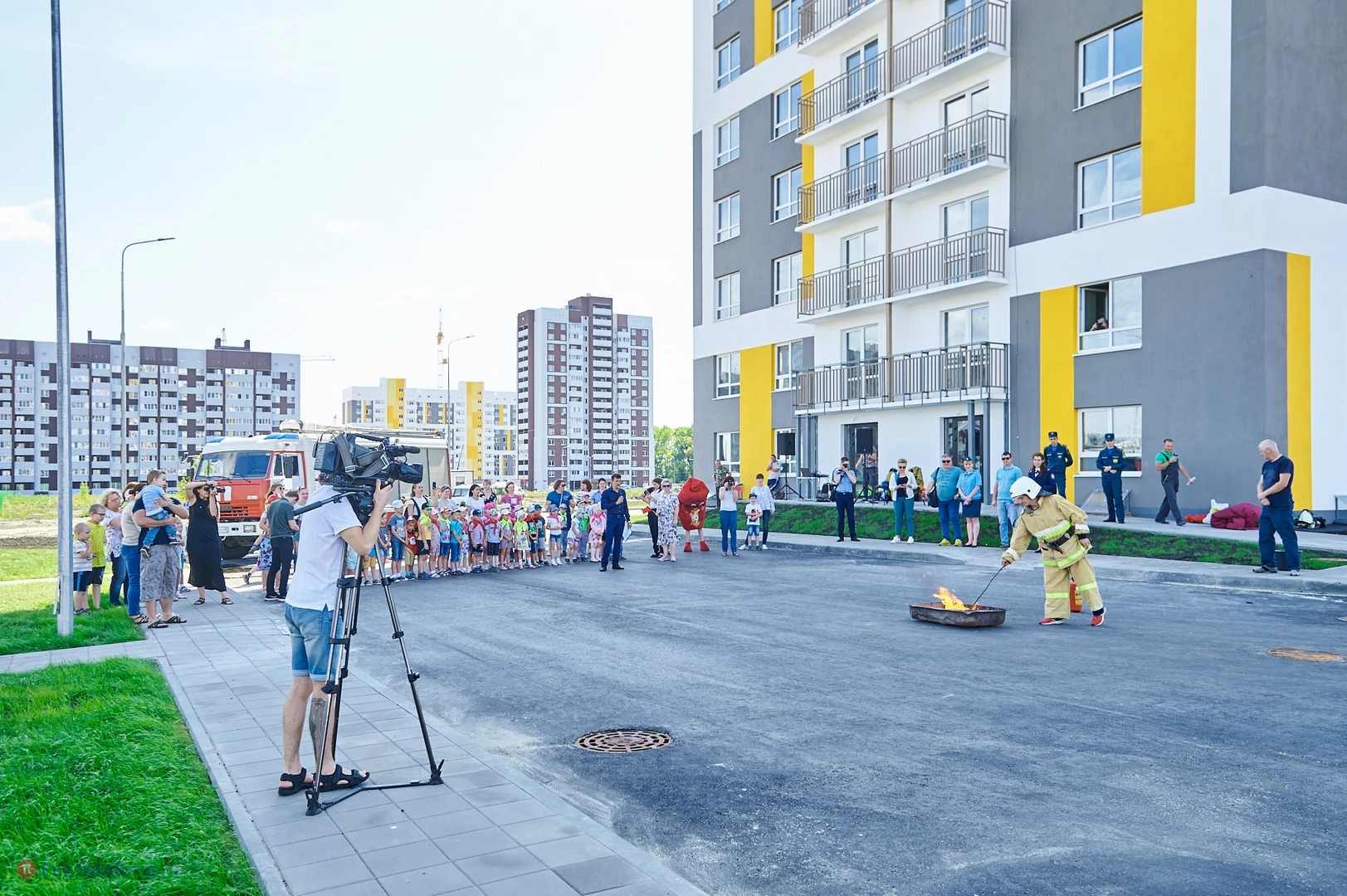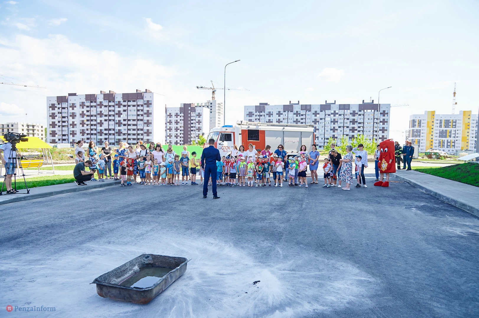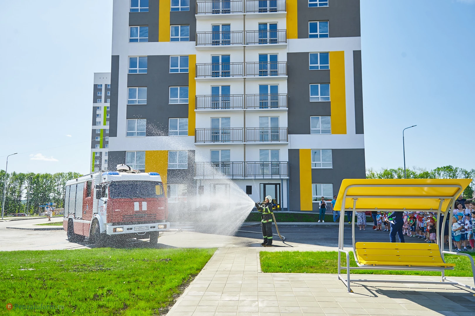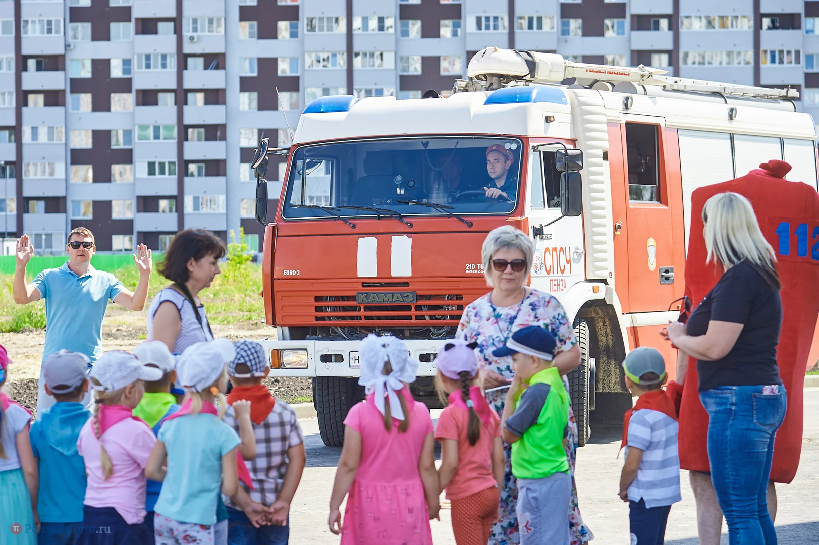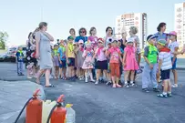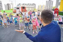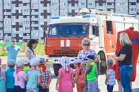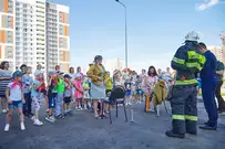 На новую тематическую детскую площадку на ул. Генерала Глазунова, где малыши катаются на пожарных машинках, приехал настоящий пожарный автомобиль. Он прибыл не потому, что что-то произошло, а чтобы сотрудники МЧС провели мастер-класс по безопасности для детей и их родителей.