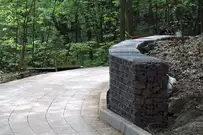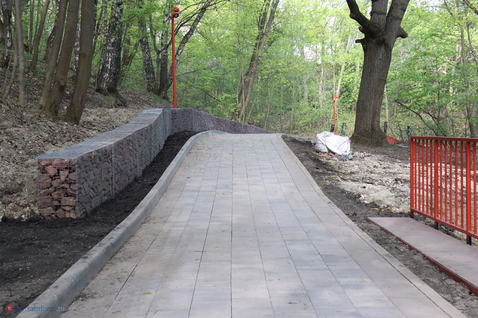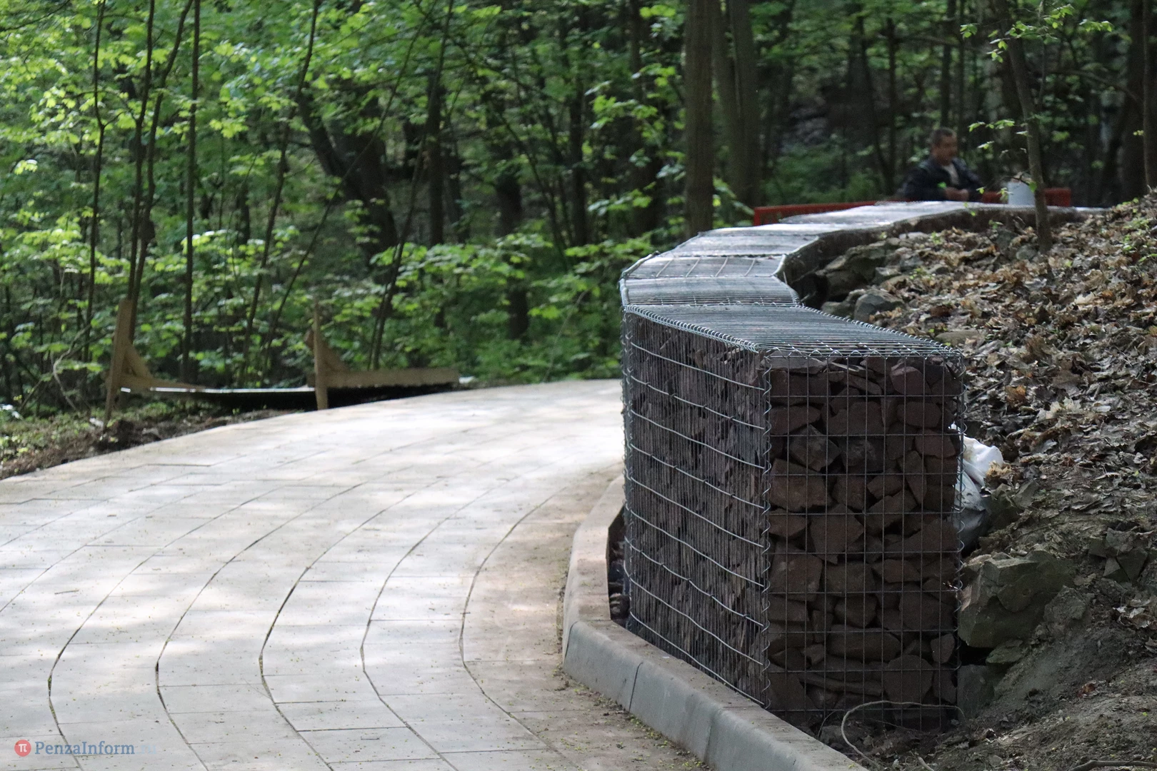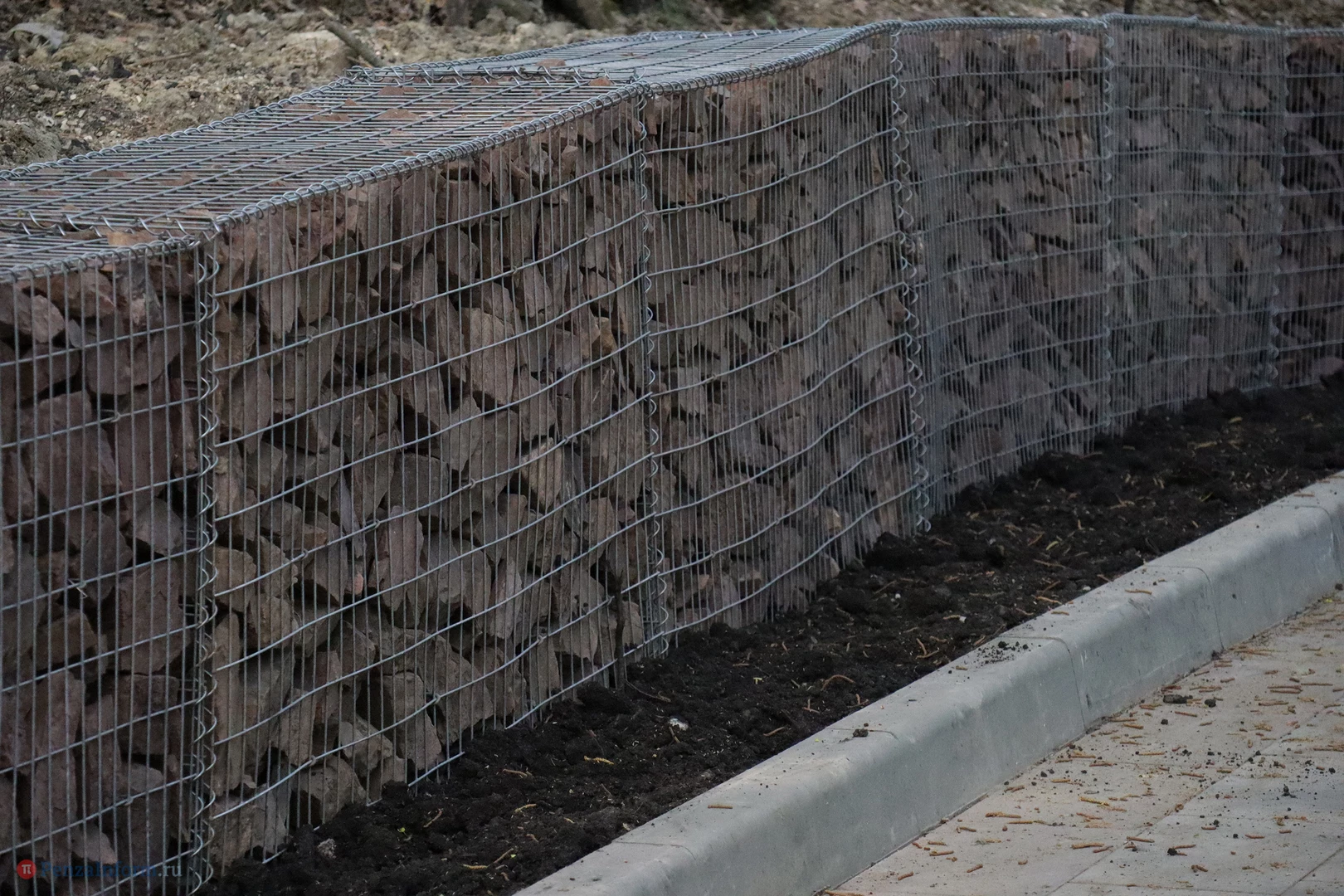 Прогулочную зону выложили плиткой и связали лестницами с парком Белинского. На отрезке, который до холодов укрепили шпунтами, установили ограждения. Там, где уровень земли существенно выше уровня покрытия, обустроили габионы - конструкции из проволоки, наполненные красным камнем и предназначенные для защиты от сползания грунта.