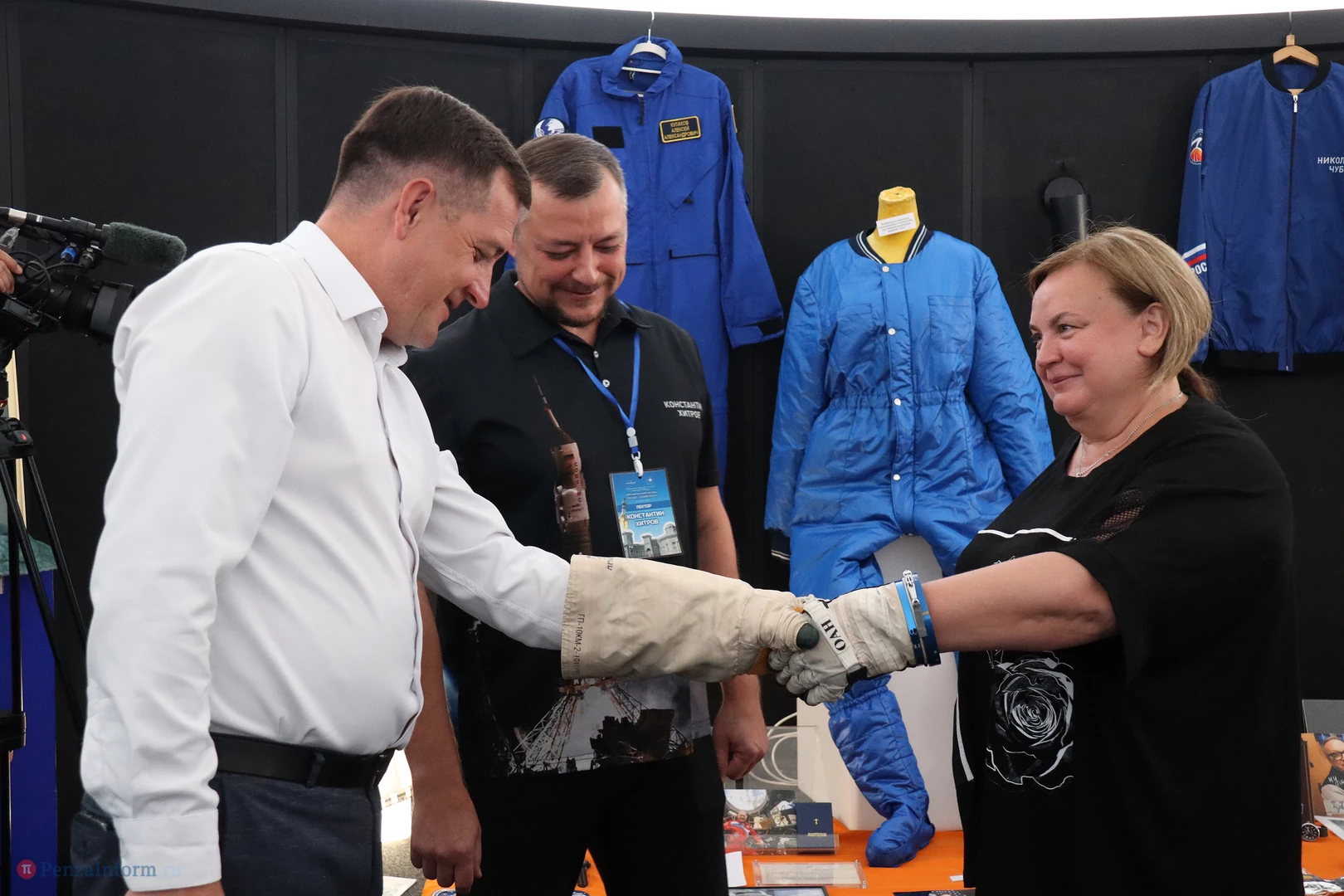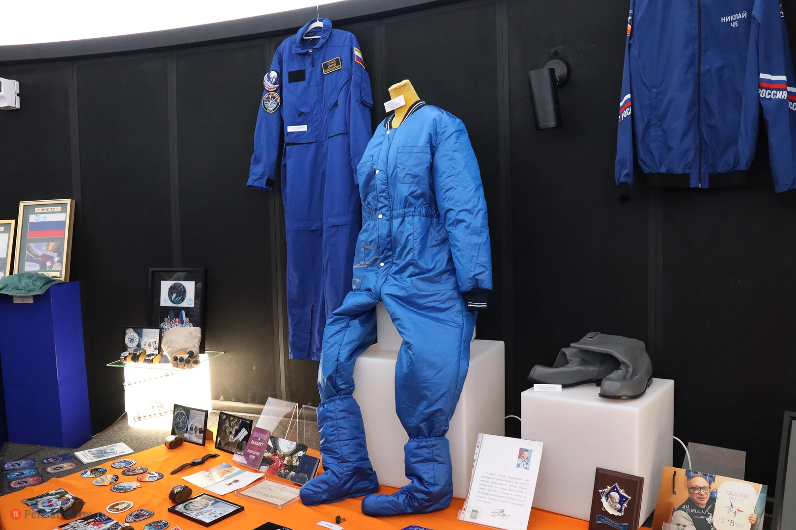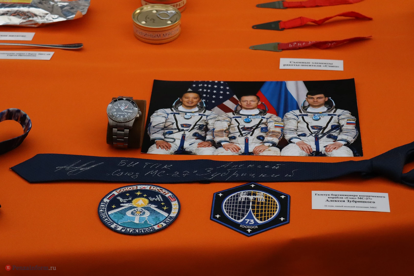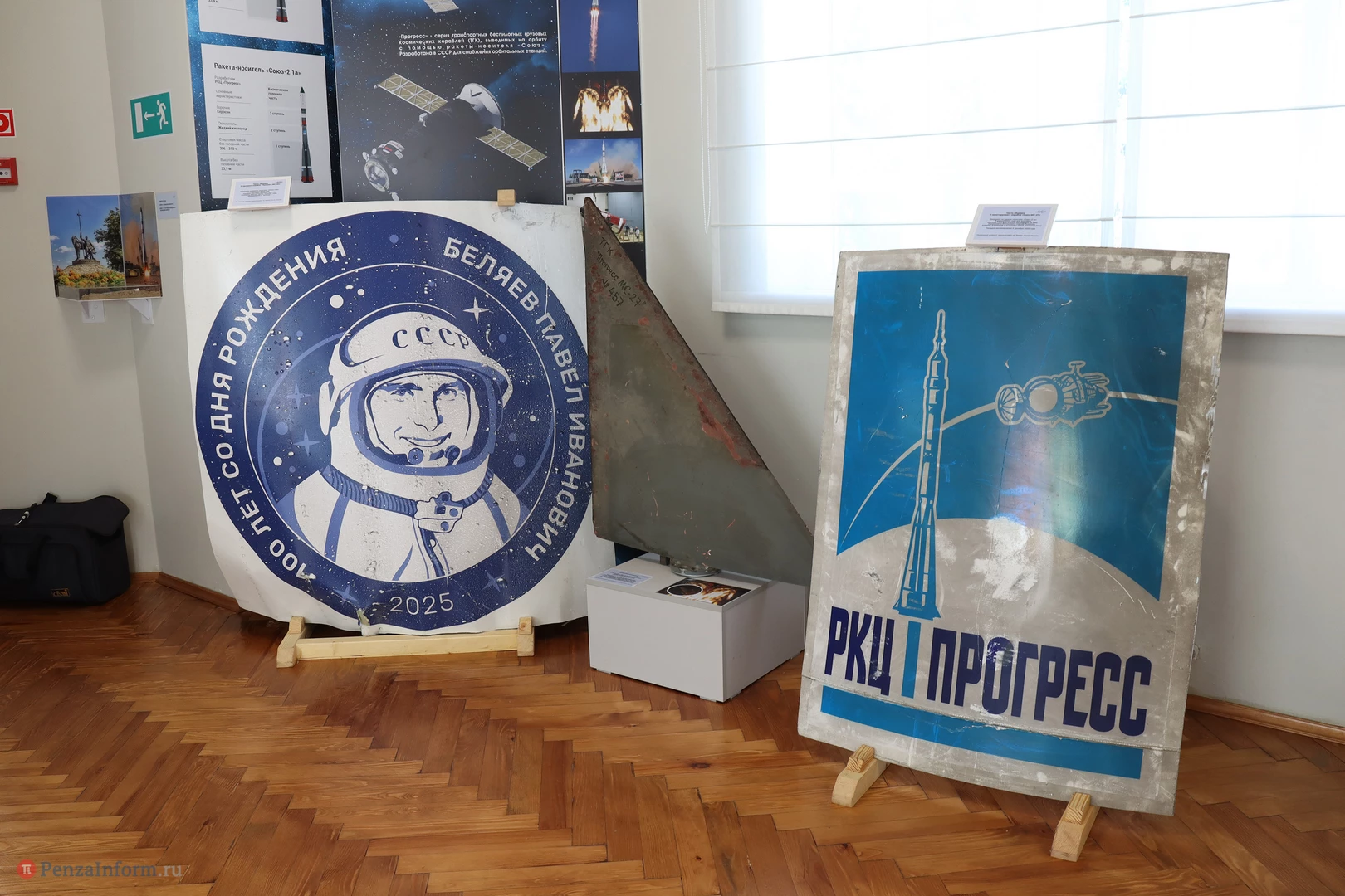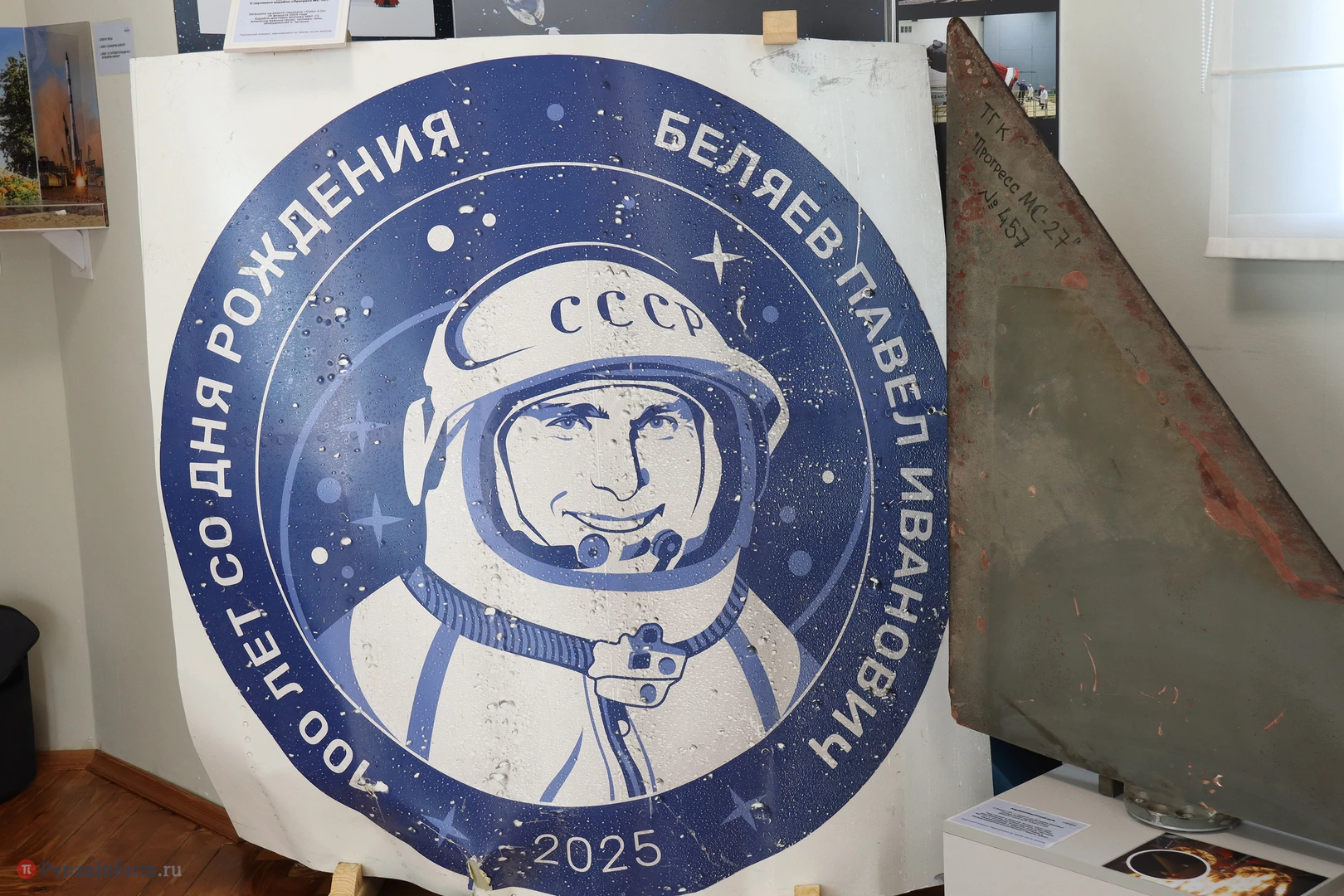 Посетителям представили уникальные экспонаты: фрагмент головного обтекателя с изображением космонавта П. И. Беляева, аэродинамический руль, часть обшивки ракеты-носителя «Союз-2.1а», перчатки от скафандров двух видов («Сокол» и «Орлан»), личные вещи космонавтов и многое другое.