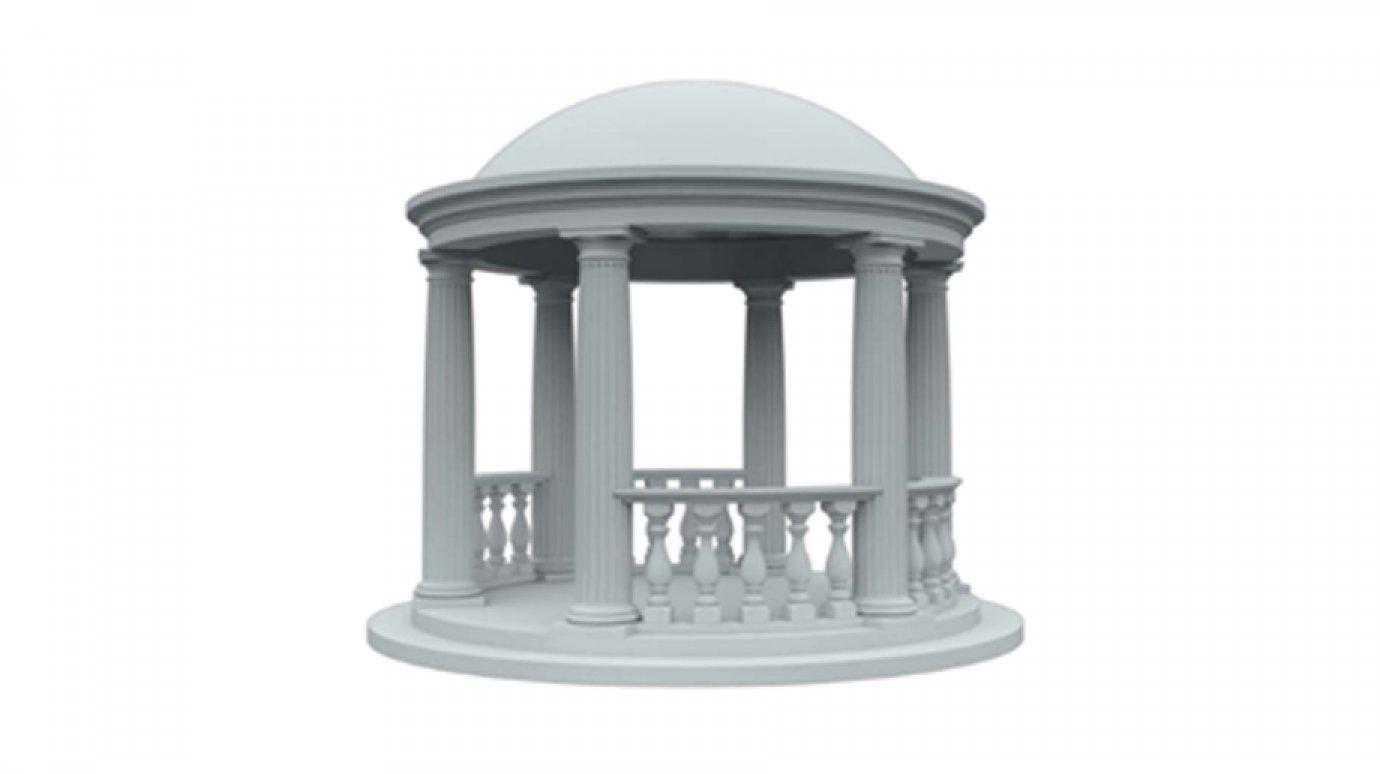 В документах аукциона есть описание будущей ротонды. Она должна быть белой, высотой не менее 4 метров, диаметром не менее 3,8 метра. Пол, купол, 6 колонн и балюстраду необходимо выполнить из архитектурного бетона. Приложен и примерный эскиз объекта (на фото).