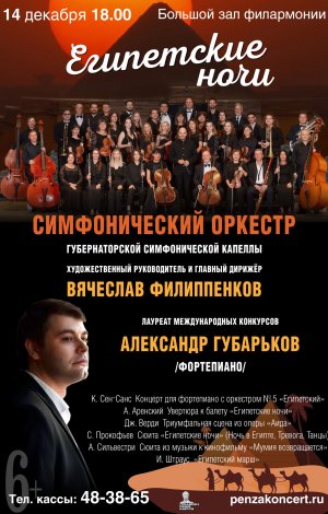 Симфонический оркестр Губернаторской симфонической капеллы под управлением заслуженного артиста Пензенской области Вячеслава Филиппенкова и лауреат международных конкурсов Александр Губарьков (фортепиано) представляют программу «Египетские ночи».