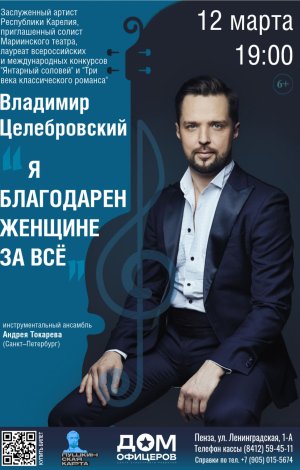 Концерт известного оперного баритона Владимира Целебровского и инструментального ансамбля под управлением Андрея Токарева (Санкт–Петербург) — «Я благодарен женщине за все».Владимир Целебровский – заслуженный артист Республики Карелия, приглашенный солист Мариинского театра, лауреат всероссийских и международных конкурсов («Янтарный соловей», «Три века классического романса», «Весна романса», «Terre dei Fieschi» и др.). Целебровский пo праву cчитaeтcя одним из лучших баритонов современной России — его глубокий завораживающий голос проникает в самую душу слушателя. Каждый выход Владимира на сцену – это всегда праздник и громкие несмолкающие овации! Артист ведет активную гастрольную деятельность, с неизменным успехом выступая сольно и участвуя в оперных постановках на лучших площадках страны. Артист неоднократно посещал Пензу в качестве почетного гостя и эксперта межрегионального песенного конкурса-фестиваля «Когда цветут сады». Уже тогда, буквально по короткому приветственному участию питерского исполнителя в рамках фестиваля, публика Сурского края успела отметить высочайший профессиональный уровень артиста и широту палитры его сценических образов.В этом году (впервые в Пензе!) Владимир выступит с отдельной праздничной программой-посвящением «Я благодарен женщине за все». Мастерство Целебровского раскрывает тщательно подобранный репертуар. Зрителей весенней программы ждет волшебное путешествие во времени, когда на эстраде блистал ироничный и неподражаемый П.Лещенко, пели о высоких чувствах легенды советской эпохи — М.Магомаев и Э.Хиль, восхищал романтичностью и глубиной Е.Мартынов. Особая проникновенность и трепетное звучание читаются в талантливой подаче Целебровским уникальной мелодики композиторов А.Бабаджаняна («Твои следы», «Благодарю тебя») и М.Таривердиева («Не исчезай»). Не устают удивлять поразительной яркостью неаполитанские песни и современные городские романсы…