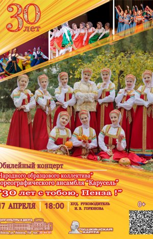 В основе концертной программы «30 лет с тобою, Пенза!» - яркие танцевальные и вокально-хореографические картины, отражающие историческое и культурное наследие наших предков, любовь к Родине и народам, ее населяющим, восхищение красотой природы и гордость за свою страну – то, на чем вот уже 30 лет зиждется ансамбль «Карусель».