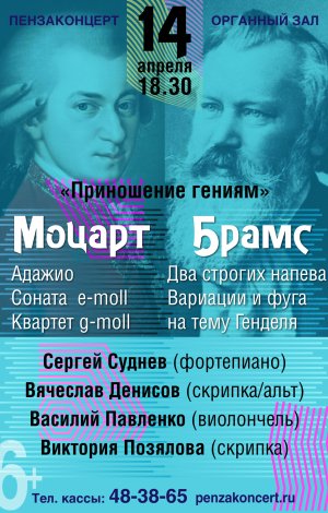 В концерте выступят Сергей Суднев(фортепиано), Вячеслав Денисов(скрипка/альт), Василий Павленко(виолончель), Виктория Позялова(скрипка).