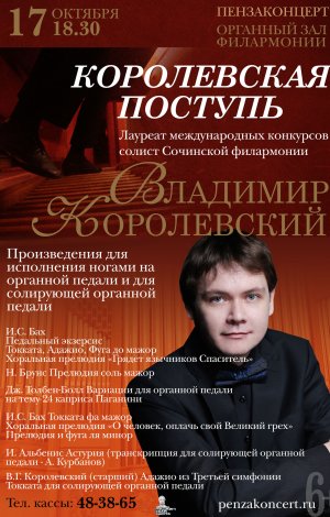 Солист Сочинской филармонии Владимир Королевский неоднократно выступал для пензенских зрителей, его выступления всегда проходят с аншлагом. Музыкант представляет новую необычную программу «Королевская поступь» – произведения для исполнения ногами на органной педали и для солирующей органной педали.