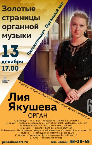 Лауреат всероссийских и международных конкурсов, выпускница Московской государственной консерватории имени П. И. Чайковского Лилия Якушева (орган, Москва) представляет новую программу - "Золотые страницы органной музыки".