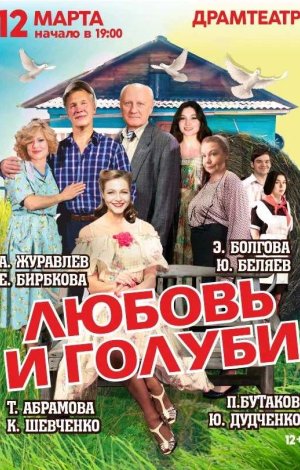 Всенародно любимая комедия и всенародно любимые актеры. В спектакле по пьесе В. Гуркина «Любовь и голуби». Лиричную, трогательную и невероятно смешную историю любви, измены и прощения вы увидите в исполнении трёх поколений «звёзд» российского театра и кино, от легендарных актёров, любимых с детства, до новых, ярких восходящих «звёзд».