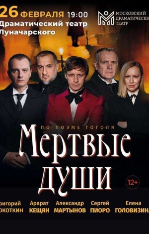 Московский драматический театр представляет свою версию вечной классики! Весёлая и тонкая интерпретация поэмы Николая Гоголя «Мёртвые души». Взгляните, как увидели историю Чичикова актеры из любимых вами кинофильмов и телесериалов: Александр Мартынов («Универ. Новая общага»), Арарат Кещян («Универ». «Универ. Новая общага»), Сергей Пиоро («Универ. Новая общага». «След»), Елена Головизина («След», «Универ. Молодые»), Григорий Кокоткин («Универ. Новая общага»).
